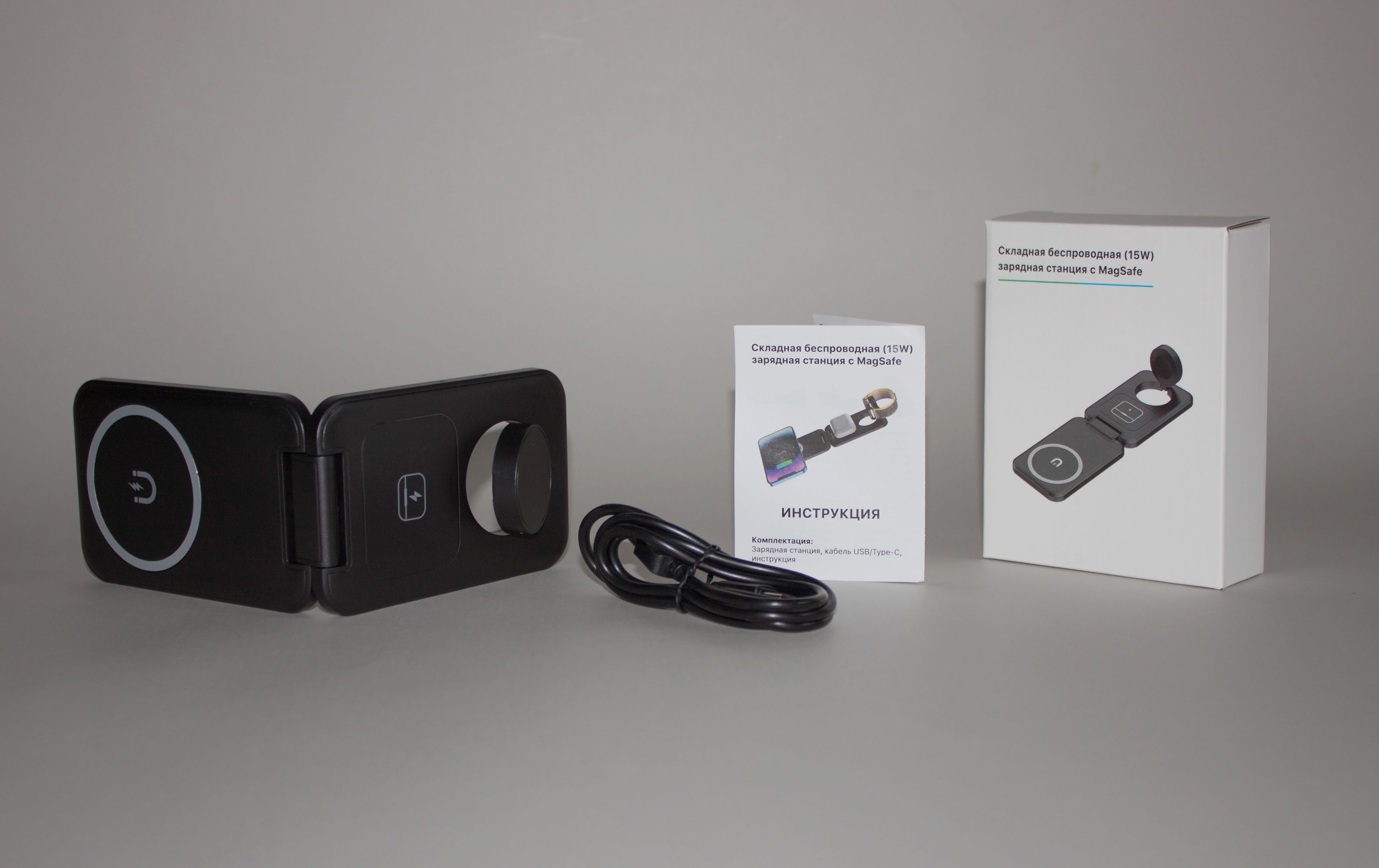 Компактный гаджет - складная беспроводная (15W) зарядная станция 3-в-1 с функцией MagSafe - магнитным держателем для iPhone двенадцатой серии и выше. Данный держатель позволяет закрепить (примагнитить) iPhone горизонтально на зарядном блоке для удобного просмотра фото/видео на его экране. Для большего удобства в конструкции подставки предусмотрены 2 угла обзора экрана.
